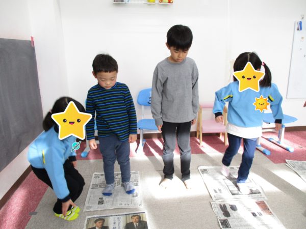 今週は新聞紙を使用し、お友達と協力するルール遊びを行っています。