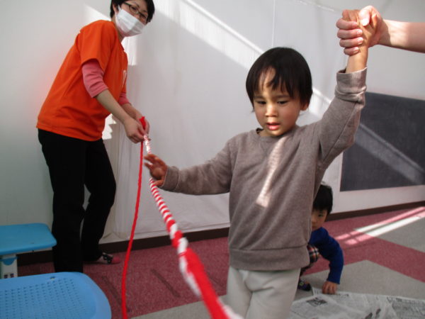 お友達に「いいよ」「新聞持って」など声をかけながら道を作っていきます。