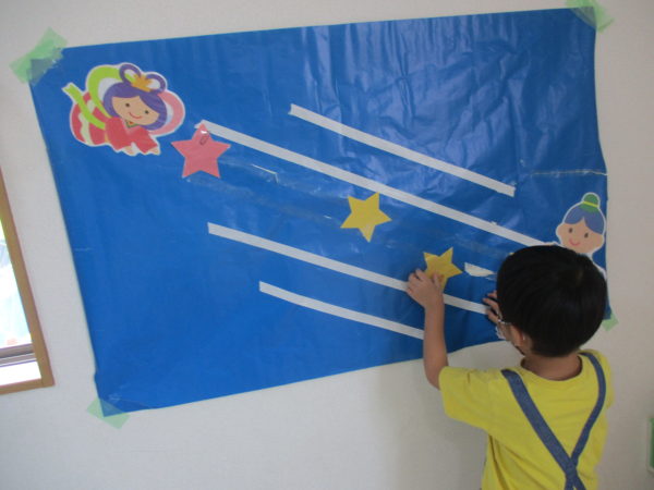 おりひめ様とひこぼし様の間にある天の川に貼っていきます。