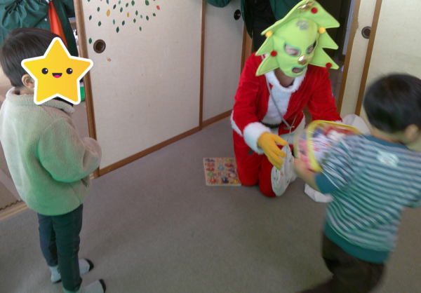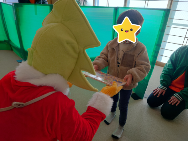 駅前教室を代表して、サンタさんからプレゼントのブロックとパズルを受け取ったお子さんたち。