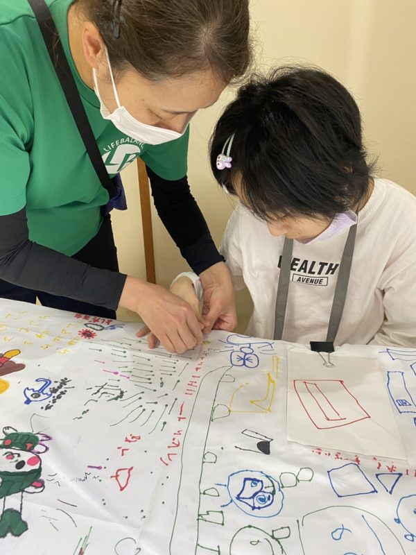 大きな布を目の前に、皆さまワクワク!紙ではなく、布に直接ペンで書くって、少し特別感がありますよね♪しかも真っ白な大きな布です。「え?良いの!?」と目をキラキラさせながら、大きなキャンバスに思い思いに素敵な絵を描いてくれました(≧▽≦)