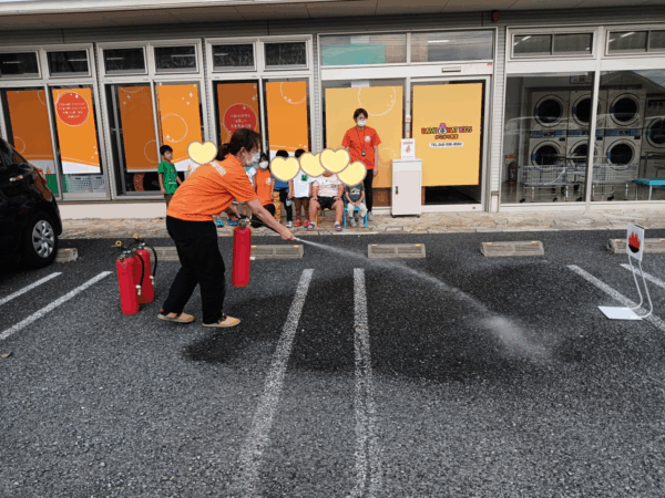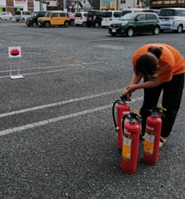 避難訓練の後は、指導員による「水消火器」を使った消火訓練を行いました。
