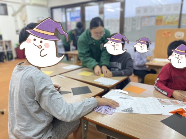 お子さんたちが折り紙や画用紙を使ってカボチャやクモの巣の飾りを作ってくれました。