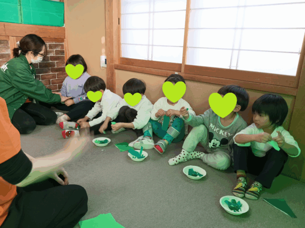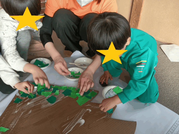 緑と黄緑の折り紙をちぎって、のりが塗られた段ボールに貼っていく作業です。