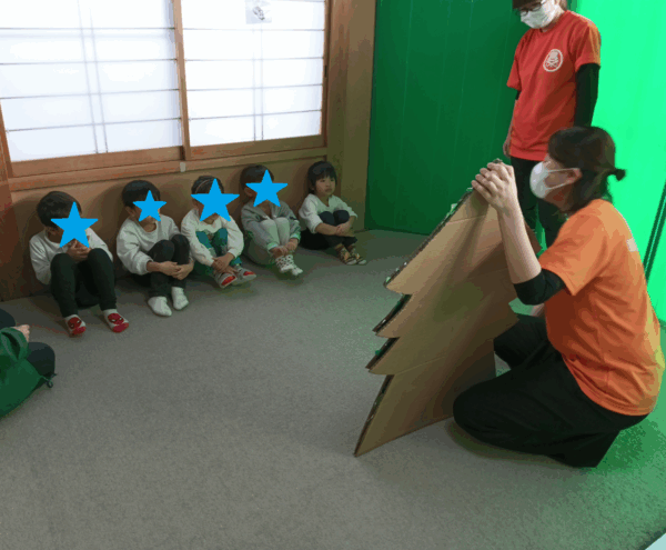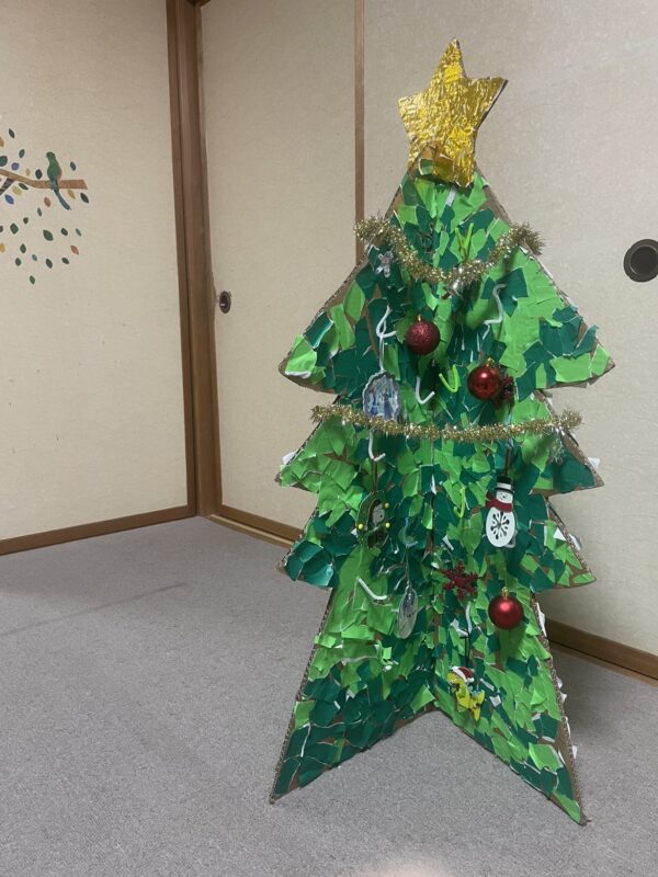 これまで教室には立体的なツリーがなかったため、「みんなで作ってみよう!」ということで、今回は段ボールを使った大きなツリーを作成することにしました。