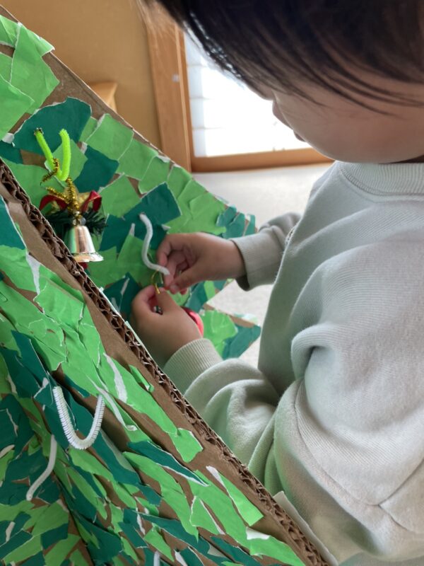 折り紙を貼り終えたあとは、オーナメントを引っかけられるようにして、飾り付けも行いました☆