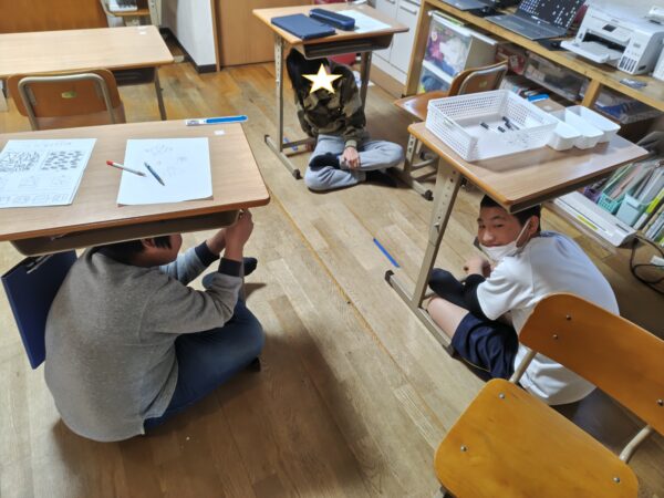 地震発生を知らせる職員の声。子ども達は落ち着いて指導員の指示に従い、