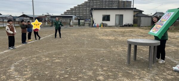 クリスマスの日に間に合うよう、みんなで力を合わせてマラソンリレーを行い、走り終わったら裸の雪だるまにシールを貼っていきました⛄✨