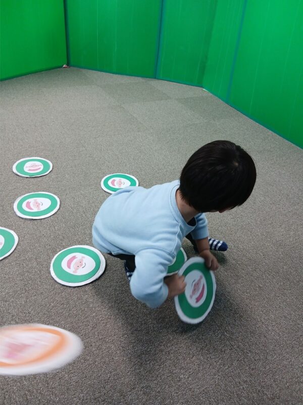 裏表にサンタとトナカイが書いてあるプレートを、先生が指示に従いながら絵柄をひっくり返していく競争。