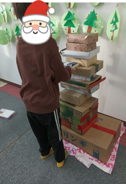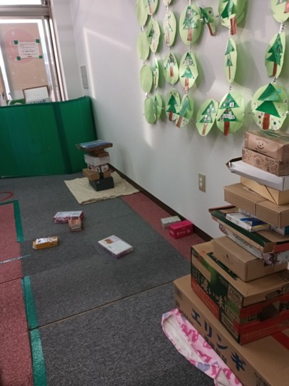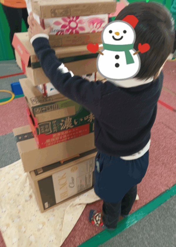 急なルール変更にもしっかりと対応ができ、お友達全員で箱積みを行い、とっても高く積み上げることができました。