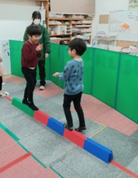 平均台の上を進み、お友達と出会ったらじゃんけん!