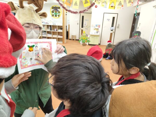 「こんにちは~!」と挨拶をしてお子さん1人ひとりにプレゼントをお渡ししました。