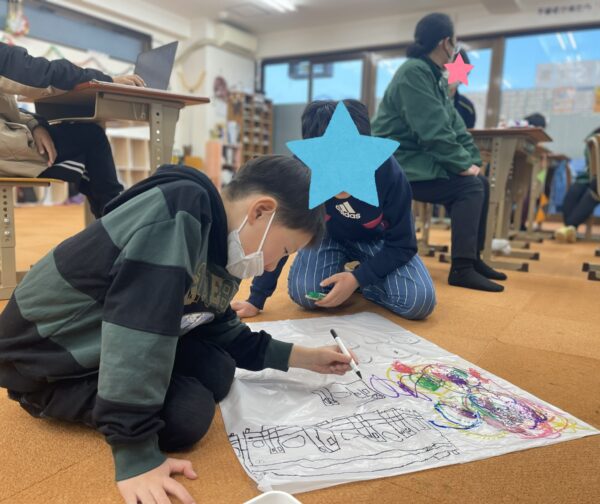ビニール袋をデザインしたプレゼント袋を持ってかごはら教室にお邪魔しました。