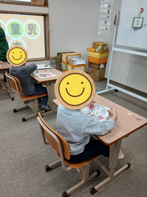 福笑いではアンパンマンやピカチュウなど、お子さんの好きなキャラクターの中から、好きなものを選び、目、鼻、口などを貼りました。