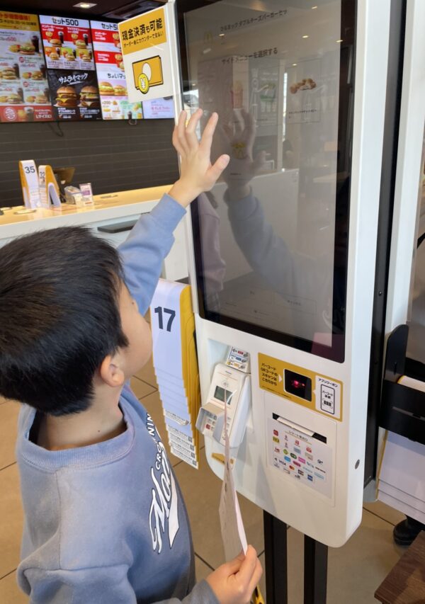 マクドナルドに到着すると…大きなタッチパネルがあり、まさかのタッチパネルで注文でした😆