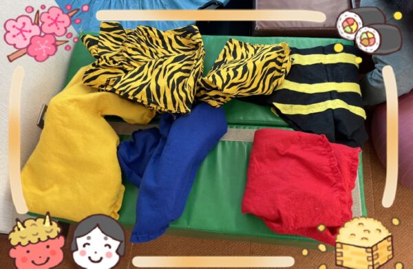 本物の豆の代わりに、やわらか〜いカラーボールを「豆」に見立てて投げるゲーム!ミッションカードには節分にちなんだミッションが🤔