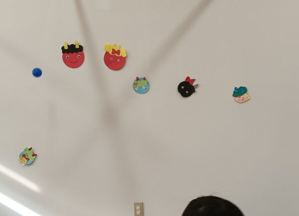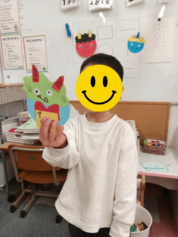 自分で作った鬼のお面を壁にはりつけ、「おにはそと!ふくはうち!」と元気な声が教室に響き、
