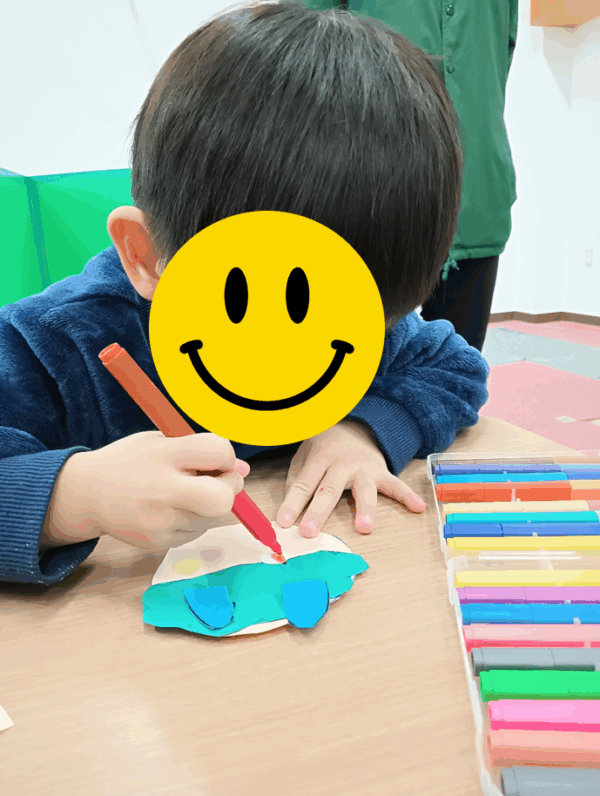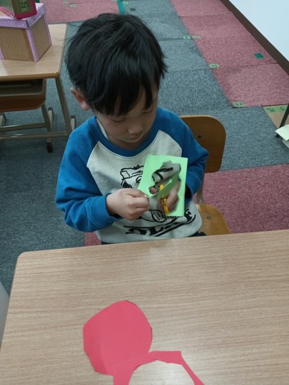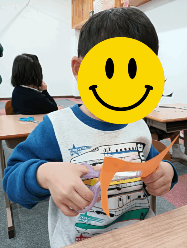 線をよく見ながら切る必要がある少し難しい形でしたが、子どもたちはそれぞれのペースで集中して取り組むことができました。