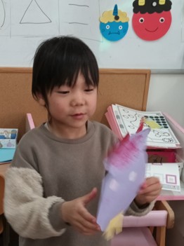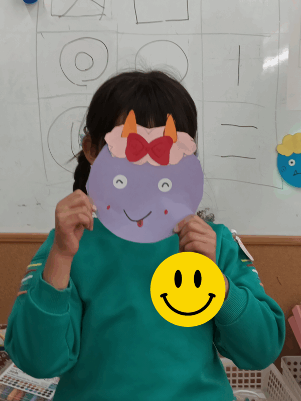 完成したお面を見て、達成感いっぱいの表情を見せてくれました。
