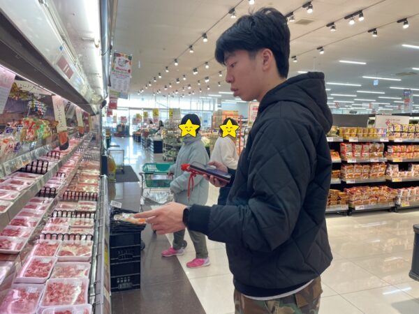 買い物では、店内の材料表示看板を見ながら、指定された売り場へ自分で移動。