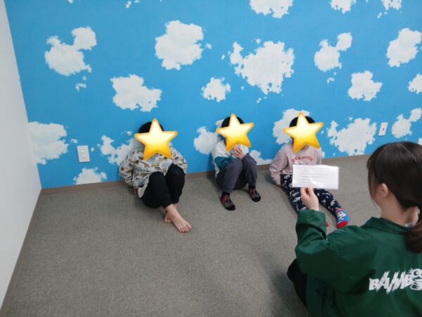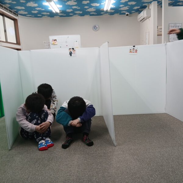 2月の集団遊びで学んだ「恐竜のたまご」の姿勢で正解発表を待っています😊