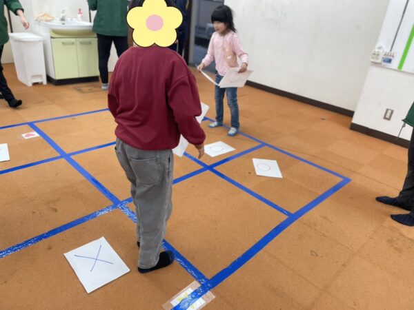 活動の中では、子どもたち同士のやりとりも見られました。「入れて!」と声をかけると「いいよ」と仲間に入れてくれたり、「〇✕ゲームはこうやってやるんだよ」とルールを説明してくれる子もおり、友だちと関わりながら楽しく活動する姿が見られました。