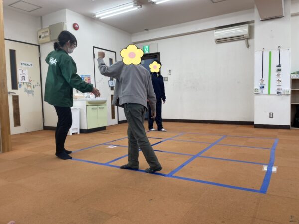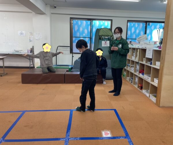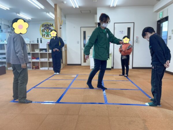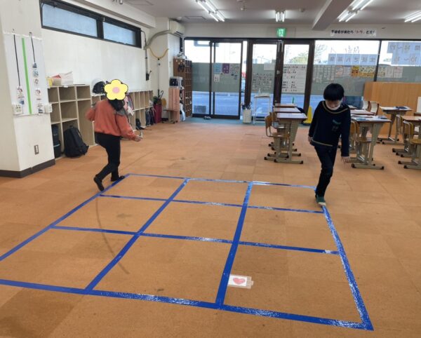 こちらの続きで、この日の活動では床にテープで作った9マスを使ってさまざまな遊びに取り組みました。シンプルなマスですが、工夫次第でいろいろな遊び方ができました。