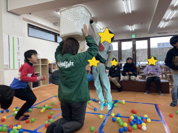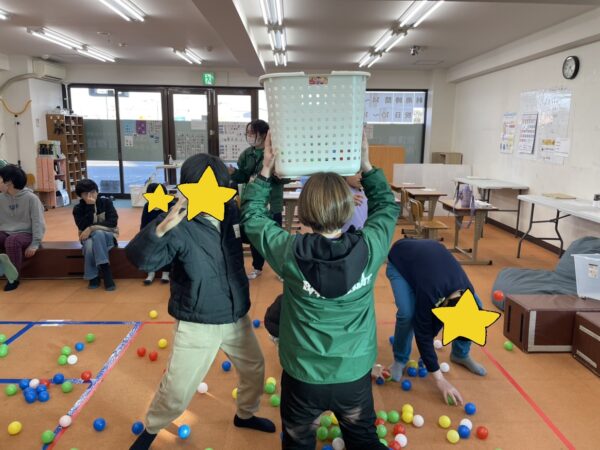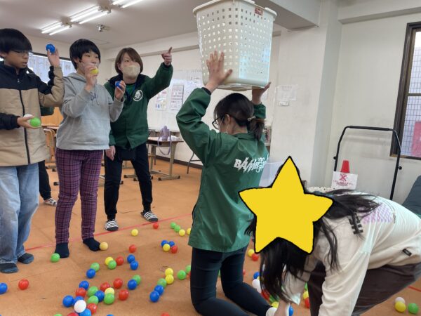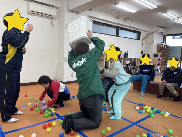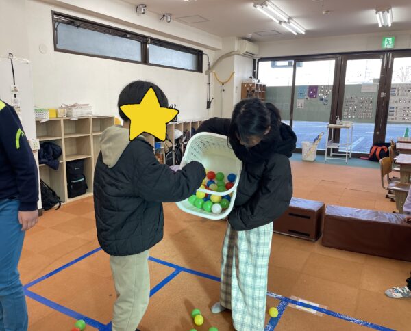 カラフルなボールを使い、子どもたちは元気いっぱいに体を動かしながら楽しんで参加してくれました。最初にルール説明を行い、順番や投げ方を確認してからスタート!回数を重ねるごとにコツをつかみ、かごをよく狙って投げる姿が見られました。