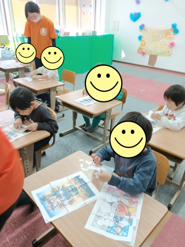 最初は5分間、パズルやクイズなど楽しい活動をしながら着席できるよう支援を計画しています。